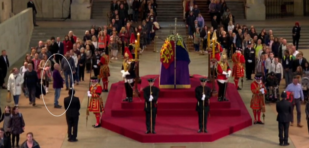 Once concluded, the lines started moving again. And before long, it was my turn. The two women who’d been part of our queueing gang all day had moved on, and I walked slowly forwards into the space at the side of the catafalque (a new word for all of us this week).